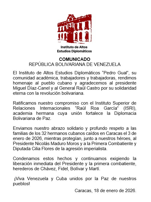 Caracas, 18 de enero de 2026 – La comunidad académica, junto a sus dedicados colaboradores del Instituto de Altos Estudios Diplomáticos «Pedro Gual», eleva un sincero reconocimiento al pueblo cubano por su inquebrantable respaldo a la Revolución Bolivariana. En este acto de gratitud, se destaca la visión luminaria del presidente Miguel Díaz-Canel y el general Raúl Castro, pilares de una lealtad que trasciende fronteras.